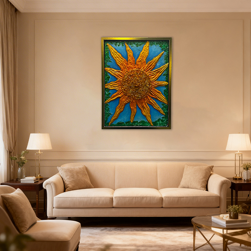 The sun symbolizes authority, confidence, visibility, and influence. This handcrafted acrylic painting with texture, crystals, light, and frame is created to activate strong social energy and recognition.